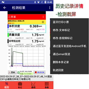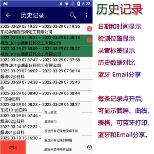 历史记录 | 显示包括:地点和位置文本、图片或视频或录音、曲线图、表格记录。 |